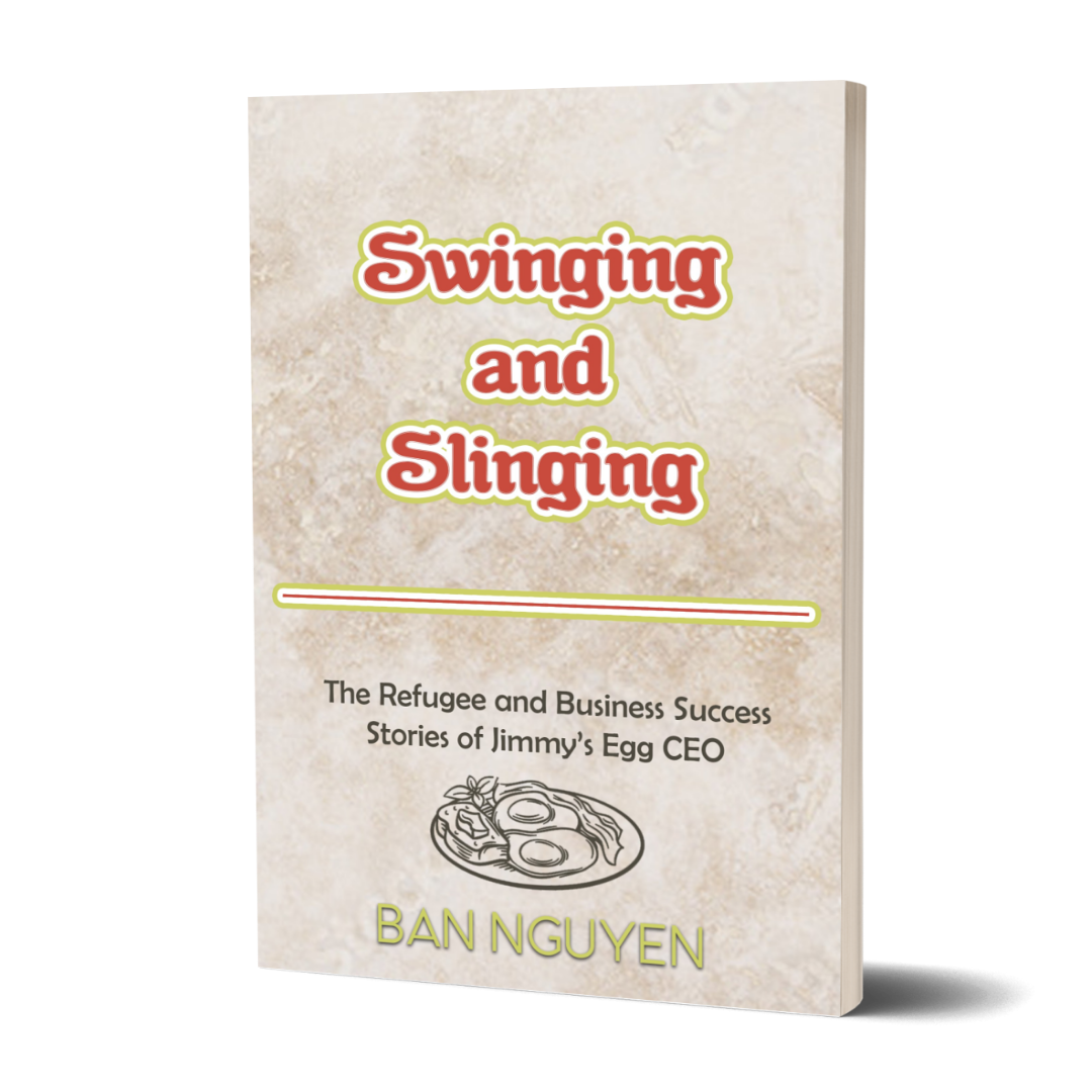 And here is a sneak peek of the cover for Ban Nguyen's memoir, Swinging and Slinging: The Refugee and Business Success Stories of Jimmy’s Egg CEO. (Coming this summer!)